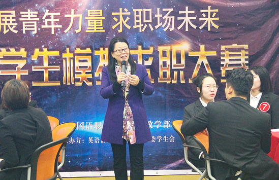 汪美萍老师为大赛做精彩点评。她表示看到选手们的精彩表现非常欣喜,同时从台风、语气、逻辑、服装、肢体语言以及简历制作等多方面给予了宝贵指导。