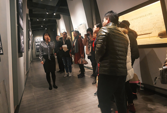 随后,跟随讲解员的话语,大家如穿越时空隧道,回到了1937年那个炎热而难忘的夏季,同志们了解到明明只有400余人的一个营,为何对外宣称有“八百壮士”,为何法租界要将谢晋元将军及幸存战士们扣留在胶州路孤军营长达4年之久,为何抗战勇士却被押送海外,直到垂老才能返回祖国。一幅幅历史照片,一件件烈士遗物,一个个杀敌场景,一段段影像资料,生动真实地展现了淞沪抗战的历史全貌以及抗日将士反抗日军侵略的壮烈情景。最让人震撼一幕场景,是我们的一名战士身上绑满了手榴弹,毅然从高处跳下,落入日军的包围中,与敌军同归于尽。每一幕复原的模拟场景,大家都驻足观看,虽默默无语,内心却早已激动万分。