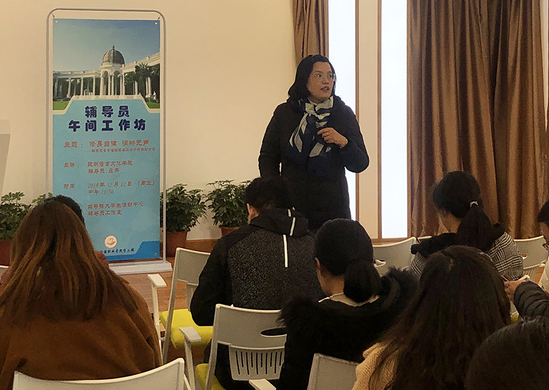 12月12日,由学生处主办的辅导员“午间工作坊”第四期学习交流活动在学校四号楼大学生活动中心辅导员工作室举行,由欧洲语言文化学院辅导员庄芹老师主讲,主题为“修身自律·润物无声——辅导员日常管理服务中的经验分享”。学生处处长陈瑜、副处长黄慧华,各院系学生工作负责人及辅导员出席活动。