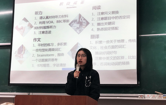 李思哲首先向同学们介绍了四级考试的注意事项,提醒大家尤其要注意答题顺序与时间分配,鼓励大家日常按照正式考试的程序进行模拟练习,以便更好地适应考试节奏。她认为,学习是一件“积微成著”的事情,经历的每一场考试都是对长期学习成果的检验。高分,绝不是来自于考前突击,而是来自于日常学习中的积淀。然后,她向同学们分享了自己在听力、作文、阅读与翻译四个模块的学习方法与感悟,从分享中可以发现,她除了善于对每一个模块特点进行精要剖析,更重要的是勤于积累。最后,李思哲说,不提倡大家考前突击,但分析考试内容与考试趋势却是必不可少的,希望大家在备考过程中积极总结问题,以考试促进日常学习,最终终会反推考试结果。