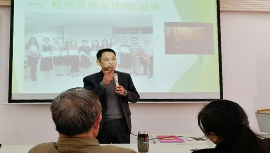 会议共分为三个议程。首先由段仁启副校长和陆效用院长共同为赴马来西亚UCSI大学参加TESOL(国际英语教师资格证)培训项目的八位教师颁发了证书。段仁启副校长对荣获证书的教师表达了祝贺,并且指出目前我校已有两批教师赴UCSI大学进行TESOL培训,共计17名教师取得证书,这标志着我校教师在专业成长上的进步,对于学校和学院来说都具有重大意义。同时,他对英语学院近两年在教师队伍建设方面的进展进行了充分肯定,并祝愿英语学院在未来取得更好的成绩。