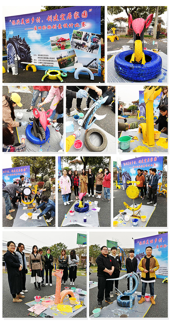 废旧轮胎华丽变身,加点创意变废为宝。4月3日,我校创意设计学院视觉传达设计专业大二学生前往浦东新区惠南镇海沈村,参加由浦东新区文创办、浦东新区惠南镇人民政府联合主办的废旧轮胎创意设计比赛。大赛旨在宣贯“生态循环、变废为宝”理念,振兴美丽乡村,创建宜居家园。