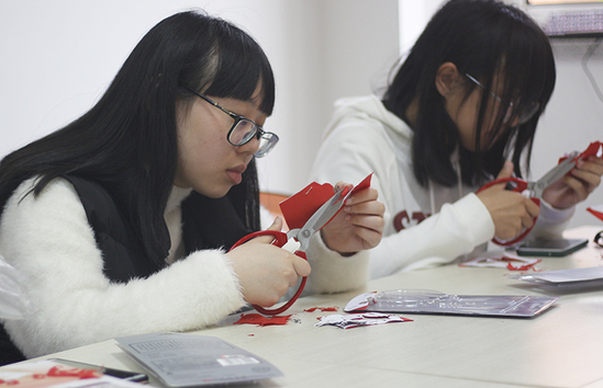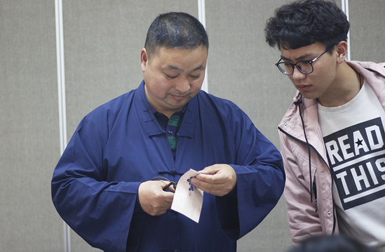 仪式结束后,剪纸第一课正式开始授课。祝军先生首先为社员分发精心准备的素材,边示范边指导,社员们认真聆听、细致模拟。随后,大家开始自己的剪纸作品创意实现,通过作品感受剪纸魅力。