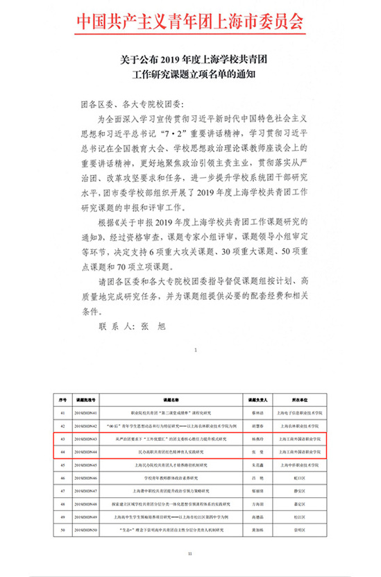 其中,我校团委书记杨燕玲老师的课题《从严治团要求下“工外优盟汇”的团支委核心胜任力提升模式研究》及我校东方语言文化学院分团委书记张曼老师的课题《民办高职共青团红色精神育人实践研究》获2019年度上海学校共青团工作研究课题重点课题立项。
