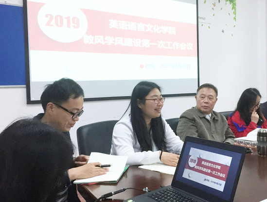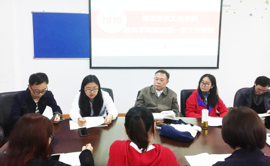 为了响应学校推行的二级学院目标管理责任制,落实立德树人的根本任务,把思想政治工作贯彻教育教学全过程,英语语言文化学院积极推进教风学风建设活动,成立学院教风学风工作小组,组长由陆效用院长领衔,副组长由申洪波副院长担任,组员由孙辉、夏洋洋、窦春霞、严华、吕旻、花莹、王欢、尹玉乾、冉蓉等教研室负责人及年级负责人组成,每学期定期开展教风学风工作研讨,就教学过程中存在的一些实际问题商讨解决方案,为师生营造良好的教和学的氛围,形成长效机制,为推动学校办特办强做出贡献。