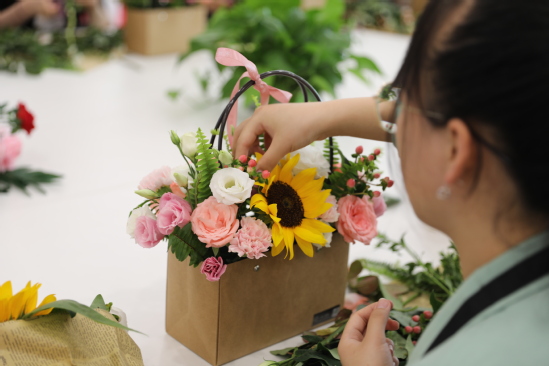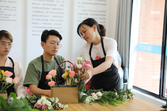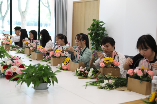 “花样年华,未来可期”插花活动特别邀请到 “一花一世界”花店的老师到场指导,为同学们进行插花专业讲解与演示。实操环节之前,老师首先对今日所接触的花材种类进行逐一介绍,并谈到“花艺是人们借助于自然界的花草作为修身养性、陶冶情操、美化生活的一种方式”,在日常生活中起到了重要的作用。随后她详细地为同学讲解了花材的种类与选取、配色方案、插花技巧等相关知识。在阵阵花香中,插花主题活动正式拉开帷幕。同学们有条不紊地对面前的花材进行选取、修剪、整枝,按照所授技巧及自己的构思动手制作。花与花之间的配合错落有致,搭配简洁大方。花木不言,三支成韵。同学们的花艺作品,形态多姿,每朵花、每片叶都寓意深刻。