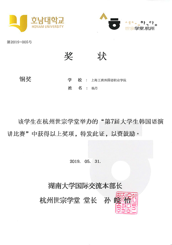 5月31日,第七届大学生韩国语演讲比赛在浙江旅游职业学院举行。我校东方语言文化学院韩语专业柳思佳、陈露和杨丹同,由罗玲萍老师带队参赛,与来自长三角地区本专科学校的15名选手同台竞技。最终,杨丹同学荣获大赛铜奖,其余两名同学获鼓励奖。