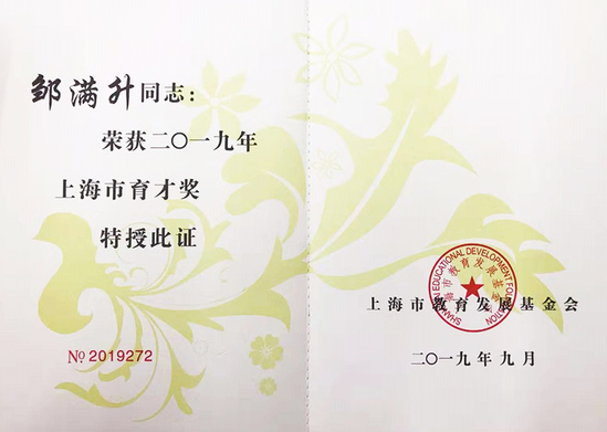 2019年4月,上海市教育发展基金会向全市高校下发《关于做好2019年“上海市育才奖”评选奖励工作的通知》。根据沪教基[2019]1号文件精神,由学校人事处牵头,在校内“事前公告,事后公示”的原则下,采取个人申报与院部推荐相结合方式,经学校评议遴选,决定推荐创意设计学院邹满升同志申报2019年上海市育才奖,并经网上公示后上报。最终,经上海市教育发展基金会和市教委有关部门组成的工作办公室评议,我校邹满升同志荣获2019年度上海市“育才奖”。