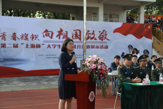 10月19日,“青春旗帜,向祖国致敬”第二届“上海杯”大学生国旗班升国旗展示活动(高职高专组)在我校隆重举行,此次活动由上海教育委员会、上海警备区战备建设局主办,上海工商外国语职业学院、上海市学校国防教育协会承办。上海市教委体卫艺科处副处长赵靖茹,上海市警备区军训办公室贾启明参谋,上海市人民武装学校校长楼陆建,浦东新区人民武装部张兴淮参谋,上海市学校国防教育协会常务副秘书长张国清,我校党委副书记、副校长段仁启出席活动。来自上海民航职业技术学院、上海交通职业技术学院、上海音乐学院等13所高校400多名师生共同参与了本次活动。活动开幕式、闭幕式由学校武装部部长陈瑜主持,展示过程由武装部副部长薛正豪主持。