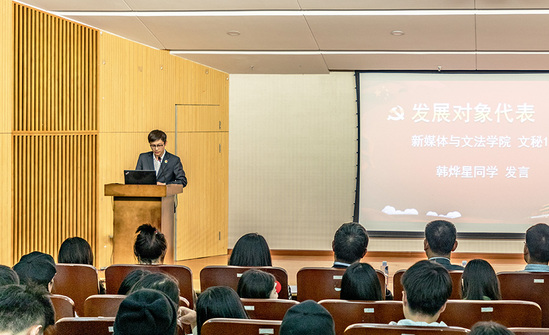 “守初心,担使命,与努力奋斗者同心,与坚持逐梦者同行!”之后,发展对象代表新媒体与文法学院文秘1701班韩烨星同学进行发言。他认为,我们需学理论,铸信仰;修品行,明大德;寻初心,记使命;发扬奋斗精神,练就斗争本领,方能实现“两个一百年”的奋斗目标,实现中华民族伟大复兴的中国梦。