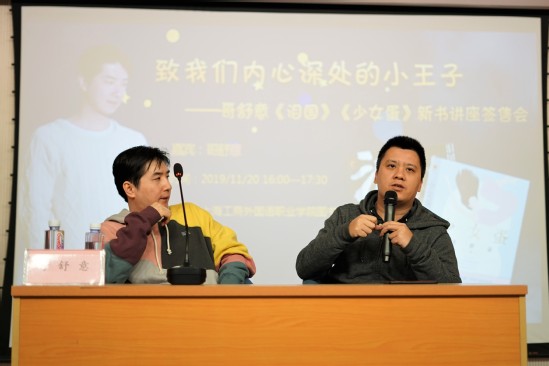 继10月30日举办“好书展销”书香校园活动后,11月20日,我校图书馆又携傅雷读书会一百余名会员在图书馆报告厅举办了“哥舒意《泪国》《女儿蛋》新书讲座签售会”。此次“新书讲座签售会”特邀嘉宾有青年作家哥舒意和上海作家协会会员、上海牧神文化传媒有限公司编辑王辉城等。