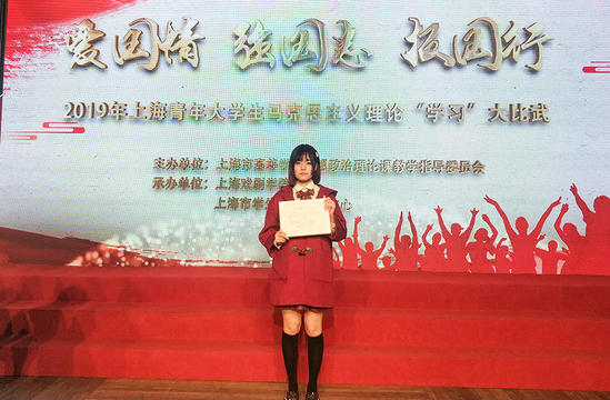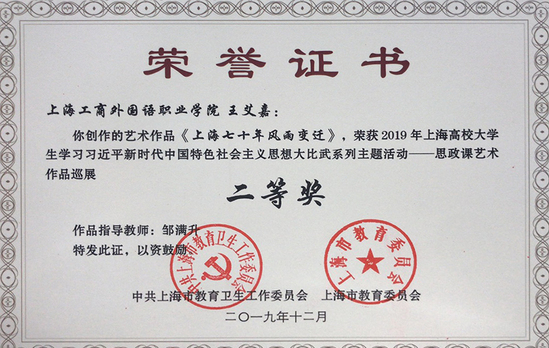 12月26日下午,“爱国情 强国志报国行——2019年上海青年大学生马克思主义理论‘学习’大比武展示活动”在上海戏剧学院举办。活动对在“2019年上海高校大学生学习习近平新时代中国特色社会主义思想大比武系列主题活动”中涌现的优秀作品和先进个人(团体)进行展示和表彰。我校王艾嘉同学的艺术作品《上海七十年风雨变迁》荣获二等奖,邹满升老师荣获优秀指导教师称号。