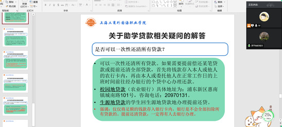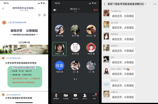 受新冠肺炎疫情影响,在今年的诚信教育主题活动中,我校创新工作形式,充分利用互联网+、微信公众号、腾讯会议等载体,通过视频会议、线上征信金融知识问答等形式,对我校毕业班助学贷款学生进行诚信及金融知识、国家助学贷款及其他资助政策普及宣传。近日,全校毕业班辅导员陆续通过QQ群课堂、微信群、腾讯会议等平台,开展了“诚信还贷、从我做起”主题班会。