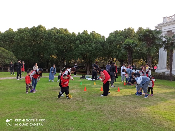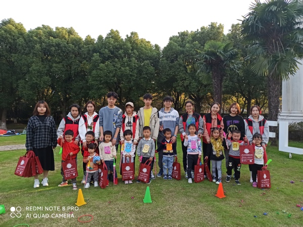 第四节属于户外游戏互动活动,学生助教带领孩子们在草地上进行障碍接力赛跑,两人三足赛跑,吹泡泡比赛等形式多样且适合孩子的活动。最后,为到场的小朋友分发礼物并合影留念。