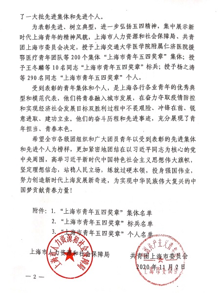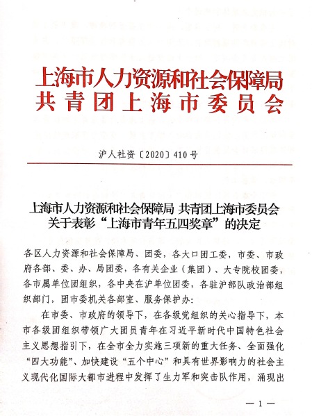 为表彰先进,大力宣传在习近平新时代中国特色社会主义思想指引下,在全市全力实施三项新的重大任务、全面强化“四大功能”、加快建设“五个中心”和具有世界影响力的社会主义现代化国际大都市进程中作出突出贡献的青年集体和青年典型,引领全市广大青年为奋力夺取疫情防控和实现经济社会发展目标“双胜利”、创造新时代上海发展新奇迹贡献青春力量,上海市人力资源和社会保障局、共青团上海市委员会联合开展了“上海市青年五四奖章”评选活动。