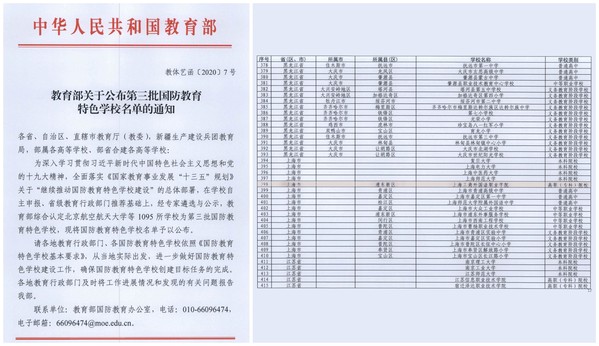 根据《教育部关于公布第三批国防教育特色学校名单的通知》(教体艺函〔2020〕7号),本次全国共有北京航空航天大学等1093所学校入选,其中本科院校60所,高职高专院校30所。上海市共5所本(专科)院校入选,分别是:复旦大学,上海电力大学,上海中医药大学,上海师范大学,上海工商外国语职业学院。