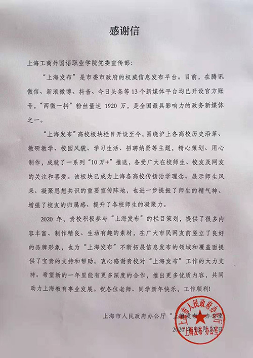 感谢信表示,”上海发布“高校板块栏目围绕沪上高校历史沿革、教研科学、校园风貌、学习生活、招聘纳贤等主题,精心策划、用心制作,成就了一系列“10万+”主题推送,备受师生、校友和网友的关注和喜爱。2020年,上海工商外国语职业学院积极参与“上海发布”的栏目策划,为高校版块提供了很多内容丰富、制作精良、生动有趣的素材,在广大市民网友前树立了良好的品牌形象,也为“上海发布”不断拓展信息发布的领域和覆盖面提供了宝贵的支持和帮助。