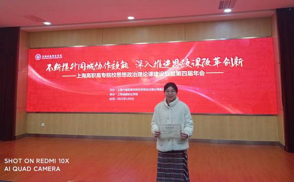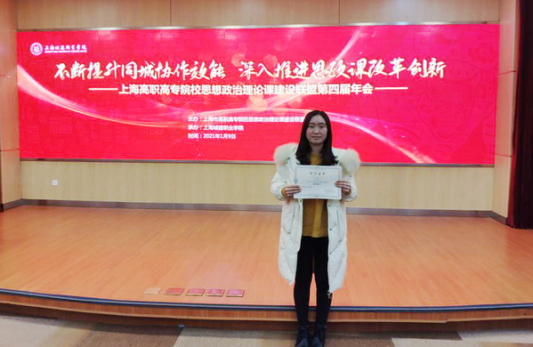 大会举行了隆重的表彰仪式,我校两位思政课教师在本年度的表彰中获得较好成绩。其中尹玉乾老师荣获2020年度第四届上海高职思政理论课“教学骨干”荣誉称号,同时获得上海高职高专院校《思想道德修养与法律基础》课教学案例比赛一等奖;赵雪老师荣获上海高职高专院校《形势与政策》课教学案例比赛优胜奖。