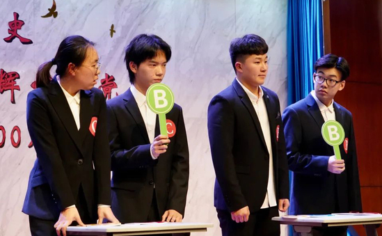 决赛赛制为积分赛,分成A、B、C、D四个小组,设置四个环节,各环节由浅入深、环环相扣。其中,“狭路相逢战”主要以书面答卷形式考察参赛选手的知识储备与记忆能力;“大浪淘沙赛”由老师随机抽题,围绕五四精神、推进中国共产党发展的领导者们、党的思想理论与发展等主题进行答题,旨在考验参赛选手的反应能力和团队协作;“智勇车轮战”主要通过举牌答题抢分;最后“时速抢答”将比赛推向高潮,让现场观众感受到青春的朝气与必胜的信念。参赛队伍你追我赶、互不相让,选手们的精彩表现展现了新时代大学生的青春力量。