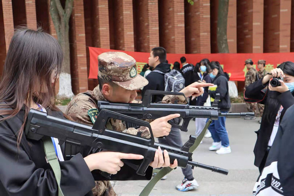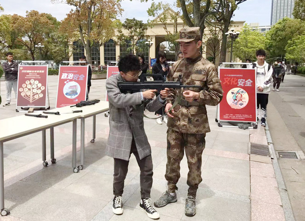 在签名现场,大学生平安志愿者队还组织了退伍的同学为大家进行了枪械战术演示以及枪械陈列展示,这引起了很多同学驻足观看,有的同学在退伍同学的帮助下,也体验了一把部队训练中的枪械瞄准、战术动作等,同学们在体验的过程中,潜意识的学习和了解了国家安全相关知识,寓教于乐,受益匪浅。