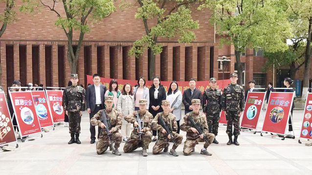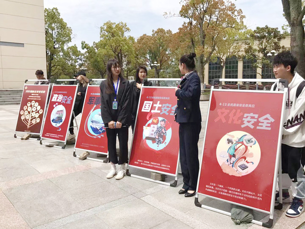 今年4月15日是我国第六个全民国家安全教育日,为了提高师生国家安全和法治安全意识,树立维护国家安全人人有责、人人尽责的使命感、责任感,营造浓厚的校园氛围,学校大学生平安志愿者支队于4月20、21日开展了国家安全教育宣传活动。校工会主席、后保处处长张永生,学工部部长、武装部部长陈瑜,武装部副部长薛正豪、学工部副部长冉蓉、商学院副院长徐天宏以及其他师生共同参加活动。