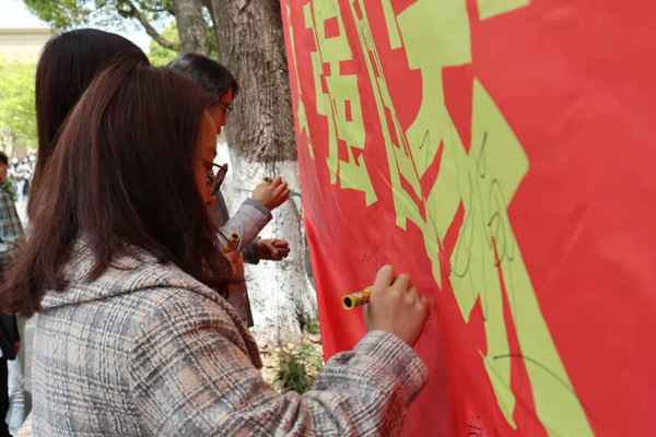 学校大学生平安志愿者队还组织发起了师生倡议签名活动,大家积极踊跃的在印有国家安全教育宣传标语的横幅上签名,用行动表决心,维护国家安全是义不容辞的责任与义务,维护国家安全人人有责。