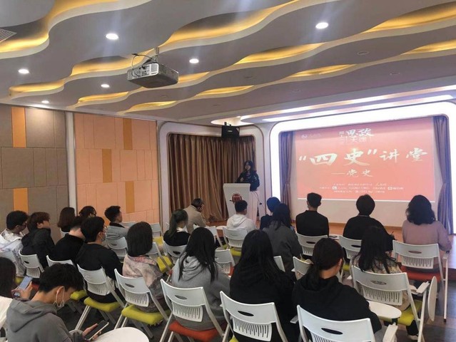 当日下午,在辅导员工作坊开展了集体学习活动,由我校两位思政辅导员倪丽娜、金琴芳组织,50名学生代表参与。在活动伊始,倪丽娜介绍了“四史”讲堂和本次集体学习的相关流程,随后,师生们一同观看了由北京师范大学赵朝峰教授、武汉大学卢勇教授以及南京航空航天大学何畏教授带来的精彩思政大课。