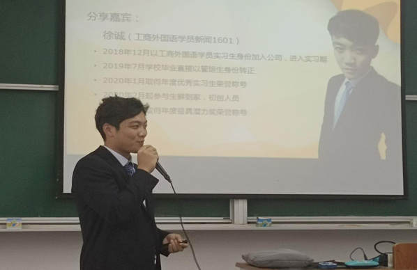 宣讲会后,学院还邀请了2016级新闻专业毕业生徐诚,他结合自身的成长历程及工作感悟做了一场职场经验分享会。徐诚目前就职于上海润生活智能科技(上海)有限公司,是公司的优秀员工,他起初从公司的一名实习生,到管培生,到正式员工,再到独当一面组建项目带领团队,他的快速成长与进步离不开自己的不懈努力。在他实习阶段,就已成为公司优秀的实习生,获得了公司年度最具潜力奖。他告诉大家:在工作中要敢于去拼搏,要有目标,要有韧劲,要能吃苦。徐诚的经验分享,为在场的同学们传递了一种正面积极的职场精神,帮助广大同学树立良好的就业观,了解职场需求,强化专业技能,为同学们进入职场拼搏打了一剂强心针。