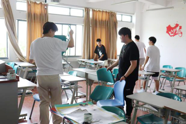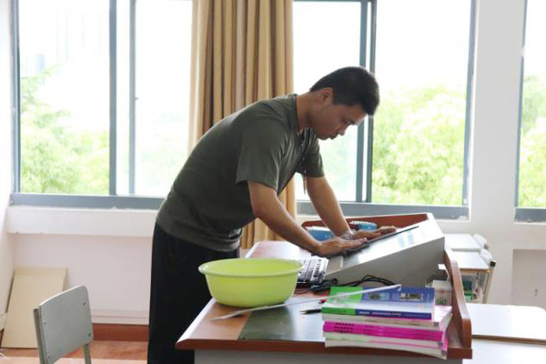 当日下午,学院党支部书记李飞带领师生党员、学生入党积极分子到7号教学楼走进教室摆放桌椅,打扫教师卫生,张贴“班级公约”和“卫生角”海报,为各教室换装添彩。经过一个半小时的辛勤劳动,16间学生教室焕然一新,物品有序,卫生整洁,干净明亮。