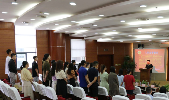 随后,欧洲语言文化学院院长王涌教授带领全体新入职的年轻教师进行入职宣誓。这铿锵有力的誓言既是使命,也是动力,必将引领年轻教师在教育航线上乘风破浪,披荆斩棘,砥砺前行。