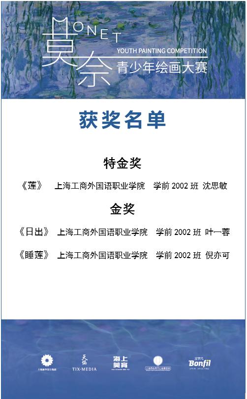 近日,由《莫奈&印象派大师展》组委会主办,上海新锐青少年艺术促进中心承办,上海同心同行公益基金会协办,法国驻上海总领事馆等单位特别支持的2021莫奈青少年绘画大赛评选结果揭晓,我校来自新媒体与文法学院的参赛学生在吴媛媛老师的精心指导下共获得3项大奖,其中沈思敏同学的《莲》作品荣获特金奖,倪亦可同学的《睡莲》作品、叶一蓉同学的《日出》作品荣获金奖。