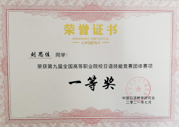 近日,第九届全国高等职业院校日语技能大赛评选结果公布,来自我校东方语言文化学院日语系专业学生刘思佳、罗嘉榛、宗子樱、李荣龙荣获团体赛项一等奖,吴鑫淼荣获个人赛项三等奖。教师崔京花、王杨超荣获“优秀指导教师”称号。