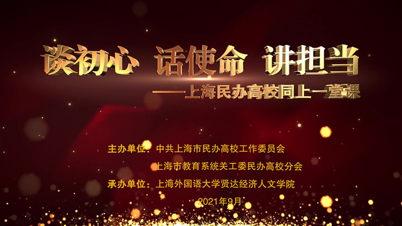 9月24日下午,上海民办高校“同上一堂课”:《谈初心 话使命 讲担当》,邀请“七一勋章”获得者黄宝妹、“最美奋斗者”杨怀远两位全国劳动模范讲述平凡人的“不平凡事”,旨在深入学习贯彻习近平总书记“七一”重要讲话精神,认真贯彻落实全国和上海高校党的建设工作会议精神,扎实开展党史学习教育,诠释、宣传伟大建党精神,以先进典型为引领,紧扣立德树人根本任务,推进民办高校党的建设和思想政治工作,努力培养德智体美劳全面发展的社会主义建设者和接班人。