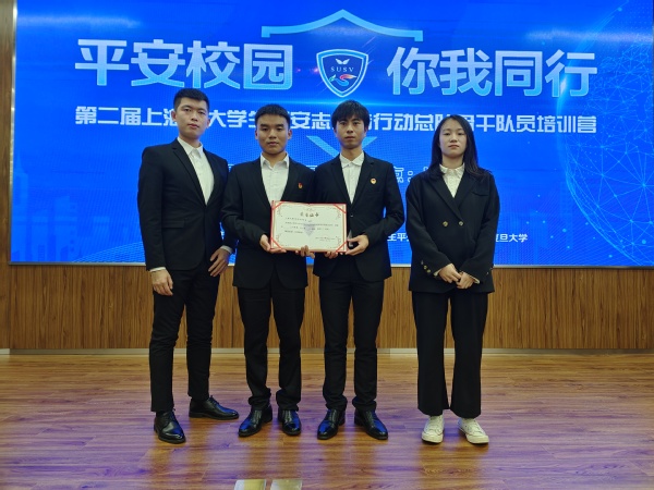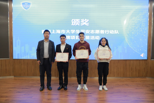 11月21日,第二届上海市大学生平安志愿者行动总队骨干队员培训员会议圆满落幕。与此同时,也一同举办了由上海市教委、上海市大学生平安志愿者行动总队主办,上海市各高校平安志愿行动支队参与的“创意品牌项目,助力平安校园”上海市首届大学生平安志愿者行动队品牌项目育苗活动颁奖仪式。来自我校的大学生平安志愿者刘雨帆、熊进龙、艾志华、毛宇欣、黄川宇、王友祥组织策划的“一心向党好儿郎”项目荣获上海市首届大学生平安志愿者行动队品牌项目育苗活动一等奖。