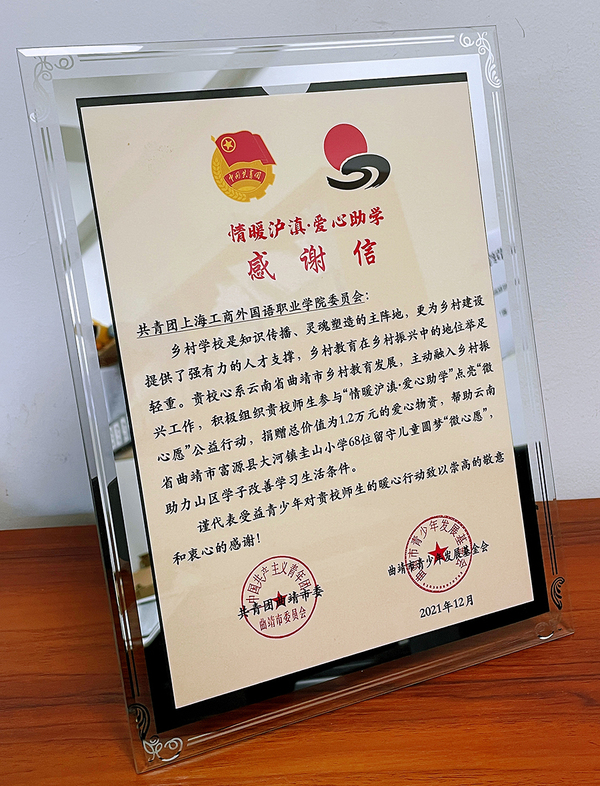 2021年11月,我校团委携手云南省曲靖团市委和曲靖市青少年发展基金会共同开展“情暖沪滇·爱心助学”点亮微心愿活动。截止至2021年12月下旬,学校76位爱心师生用169个快递包裹点亮68位圭山小学的学子“微心愿”。曲靖市团市委特此向我校发来了感谢信和捐赠证书。山海虽远,情义无距!这些“微心愿”的实现不仅表达了学校师生爱心,同时也是我校进一步落实助力精准救济、精准帮扶,更好地给贫困学子送去温暖。