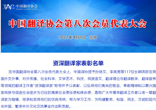 “资深翻译家”是中国翻译协会于2001年设立的荣誉称号。该荣誉称号是中国翻译界对多年来为我国翻译事业做出卓越贡献的翻译家的充分肯定,是对长期奉献翻译事业的专家学者的突出业绩和敬业精神的高度评价,是广大翻译工作者的极高荣誉。“资深翻译家”的表彰旨在学习贯彻习近平新时代中国特色社会主义思想,弘扬老一辈翻译家高尚的敬业、奉献精神和以复兴国家民族与促进社会进步为己任的高度社会责任感和使命感,激励广大中青年翻译工作者以老一辈翻译家为楷模,继承和发扬他们的优良传统,为构建繁荣、和谐、民主、文明的现代化中国,繁荣中外文化交流事业作出新贡献。