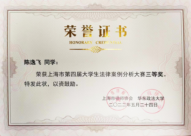 近日,上海市第四届大学生法律案例分析大赛落下帷幕,我校新媒体与文法学院法律事务专业学生陈逸飞获得三等奖,成为唯一一位在此赛事中获奖的高职学生。