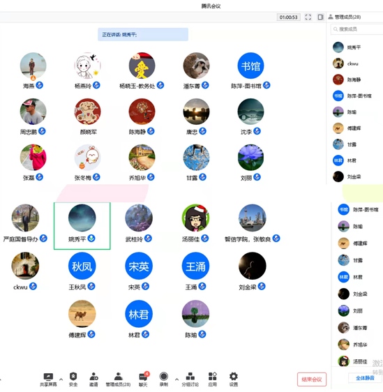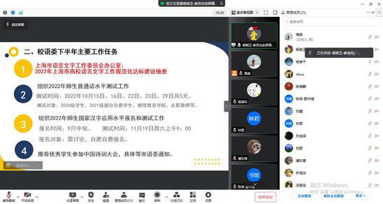 杨老师分三个方面展开会议内容,首先介绍校语委今年上半年工作情况,在第四届中华诵写讲大赛上海赛区中我校荣获多个奖项。其次,介绍校语委下半年主要工作任务,主要涉及普通话水平测试工作、国家汉字应用水平测试报名等工作。第三,重点强调高校语言文字工作规范化达标建设抽查工作的具体安排。