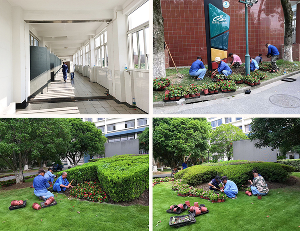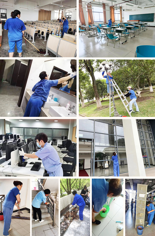 保洁、宿管部门对教室、宿舍全面大清扫、大消毒,不放过楼宇的每个角落;食堂员工全面清洁内外环境,保证食品卫生安全;维修部门对管道阀门、水泵房、变配电房、空调等设备进行检修和保养;绿化部门清洁校园环境、护理草坪;技防工作人员调试监控、维修防疫设备。