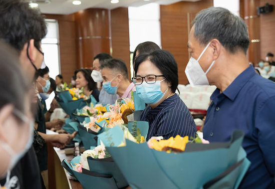 学校的发展离不开每一位教师员工的辛勤耕耘,更凝结着每一位教职员工的智慧力量,大会现场,新入职教师向学校老教师、老教授献花致敬。