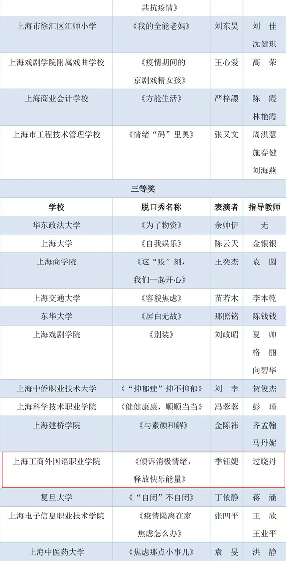近日,由上海学生心理健康教育发展中心发起的“2022年度上海学校心理健康教育活动月脱口秀比赛”结果揭晓,共评定84项脱口秀获得“2022年度上海学校心理健康教育活动月优秀脱口秀奖”。我校英语语言文化学院常洪武同学的脱口秀作品《话说心理健康》荣获优秀脱口秀一等奖,英语语言文化学院季钰婕同学的脱口秀作品《倾诉消极情绪,释放快乐能量》荣获优秀脱口秀三等奖。