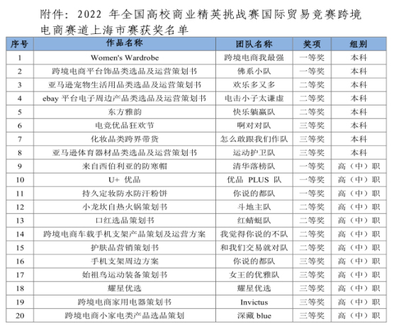 近日,全国高校商业精英挑战赛组委会公布了2022年全国高校商业精英挑战赛国际贸易竞赛跨境电商赛道上海市赛的竞赛结果,我校商学院国际商务专业4个团队喜获佳绩,顺利晋级全国总决赛。