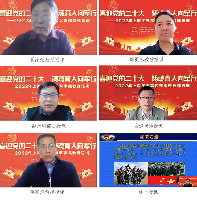 在为期3天的线上培训中,学校邀请了来自上海财经大学军事理论教研室、上海海洋大学、上海外国语大学等单位的5位专家进行精彩授课,他们分别从多方面、多视角帮助参训教师深刻理解军事理论课。