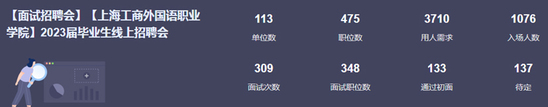 为进一步贯彻落实教育部关于做好2023届毕业生就业创业的工作要求,助推毕业生顺利就业,提高学校人才培养质量,同时搭建学生与用人单位的交流互动平台,11月3日,上海工商外国语职业学院2023届毕业生秋季招聘会通过毕业申平台采用网络直播面试形式召开。学校就业办积极联系,精心筛选报名单位,此次招聘会参会单位共计113家,提供岗位475个,需求人数3712人,注重贴近学生需求,涵盖领域广泛,岗位质量较高,共吸引我校毕业生1076人,初步达成就业意向133人。