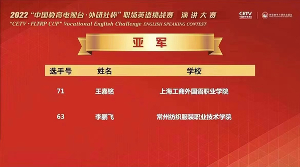 12月18日讯,在刚刚结束的2022“中国教育电视台·外研社杯”职场英语挑战赛演讲大赛全国总决赛中,我校英语语言文化学院中高贯通2103班王嘉铭同学不负众望,在激烈角逐中荣获全国特等奖亚军,为校争光。
