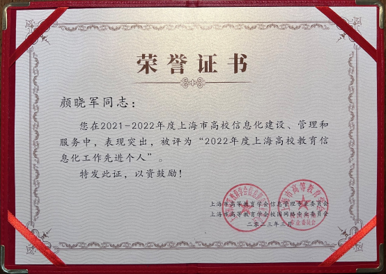 3月3日至4日,上海高等教育学会信息管理专业委员会和上海高等教育学会校园网络专业委员会共同主办的2022年度上海高校教育信息化工作先进个人表彰大会暨“高校数字化转型与创新发展论坛”在上海崇明顺利举行。经上级领导和专家评审,我校实训中心颜晓军同志被评选为“2022年度上海高校教育信息化工作先进个人”。我校作为上海市民办高校唯一获奖单位,充分显示了上级领导和专家对学校信息化建设、管理和服务工作的肯定。