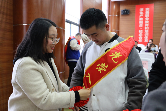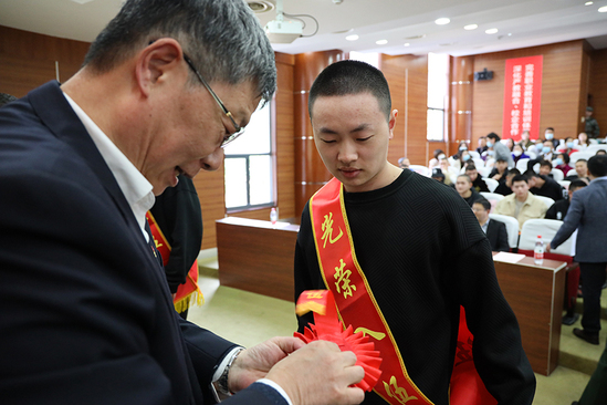 随后,学校老师一起为新兵佩戴光荣入伍红花。在音乐烘托下,会场的气氛多了些离愁,激动的心情,感伤的泪水在师生中交织传递。