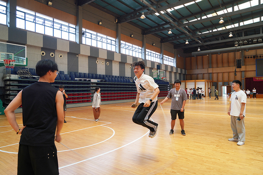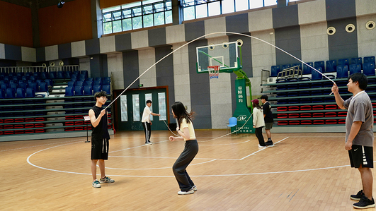 第二关需由一名队员完成边跳绳边大声唱红歌,完成后迅速跑到第三关和队员击掌。