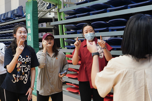 第三关由两名队员进行“你画我猜”环节,一方采用肢体动作加语言表达,考察另一方默契程度完成任务要求。完成五题跑到最后一关和队员击掌。