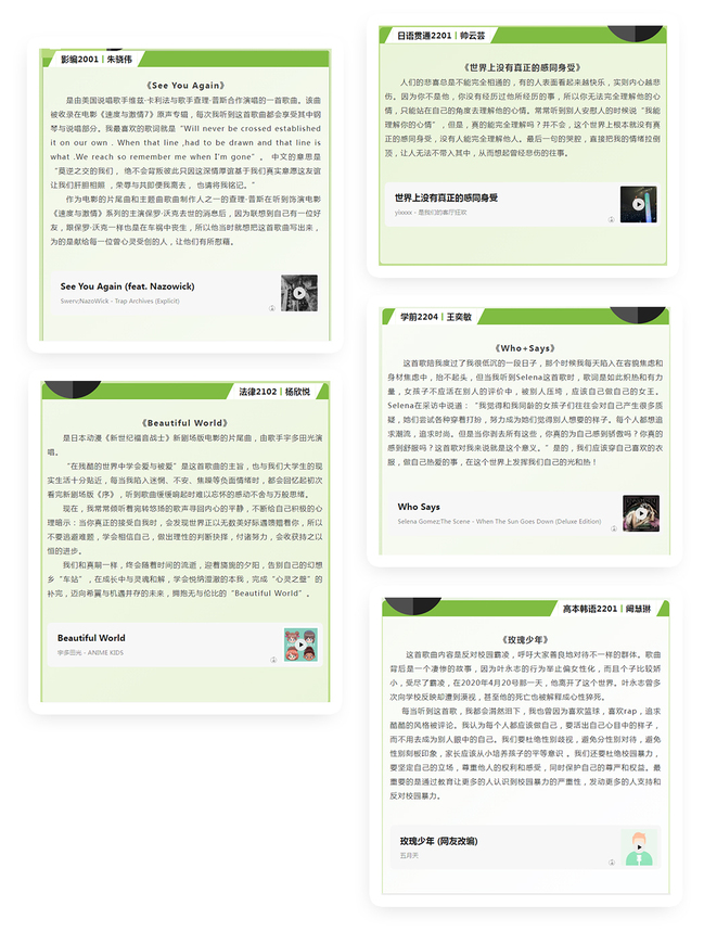 活动得到了二级学院的鼎力支持,获得了同学们的热烈响应,征集到的作品集于在SICFL心灵驿站公众号展示。本次活动作为2023年心理健康活动季的重要内容,为同学们提供了一个整理心绪、表达自我的平台,也是一项提升学生心理健康水平的创新探索。借助艺术的疗愈力量,用音符抚慰心灵。听音乐作为学生们喜闻乐见的一项日常活动,我们将继续挖掘其积极意义,应用在心理健康教育当中。